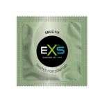 EXS Snug Fit är en extra tajt och rak kondom som påminner om ”RFSU Mamba” som kramades åt lite extra. Den är sobert designad i rektangulär folie för speciella tillfällen. Den är tillverkad i naturlatex och 100% luktfri.