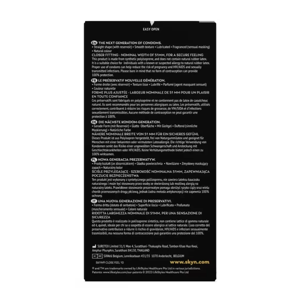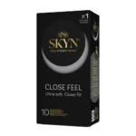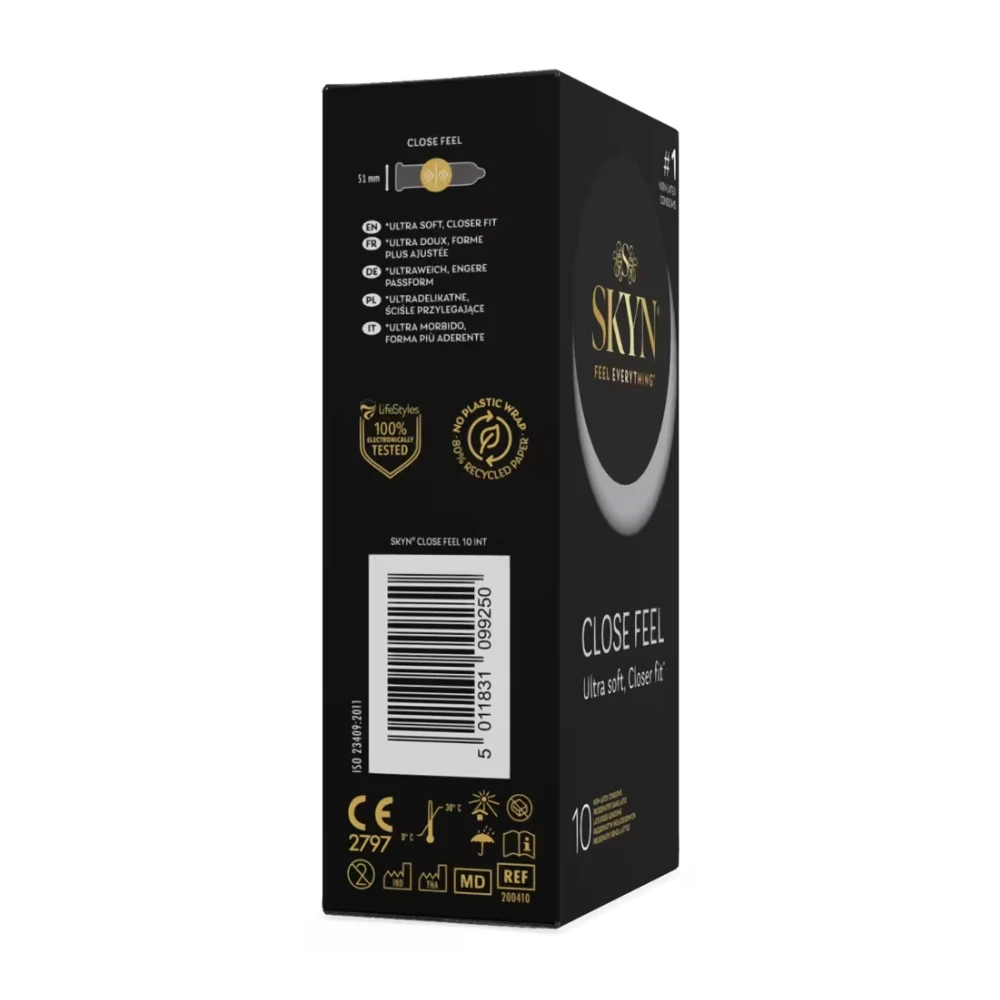 De transparenta och extra tunna kondomerna, Close Feel från SKYN, har tätsittande egenskaper. De är tillverkade av sensopren (poylisopren), vilket innebär att de är sammetsmjuka och känns väldigt realistiska. De är också latexfria och luktfria – perfekta för personer som har latexallergi eller är känsliga för latex. Kondomerna är täckta med silikonbaserat glidmedel och har behållare. Veganska.