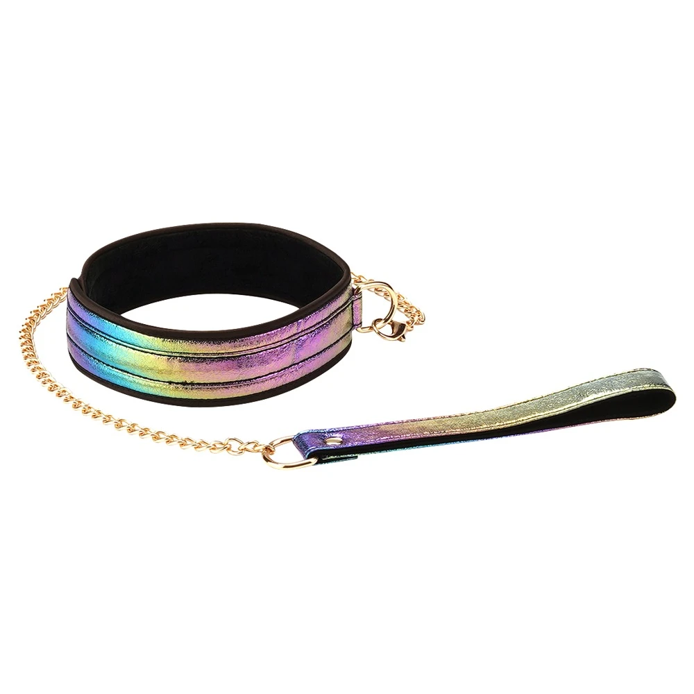 Det 8-delade bondagesetet Vivid Niji från Liebe Seele är i en vacker glänsande pärlemorlook (blank flerfärgad) med guldfärgade metalldelar och tillbehör.