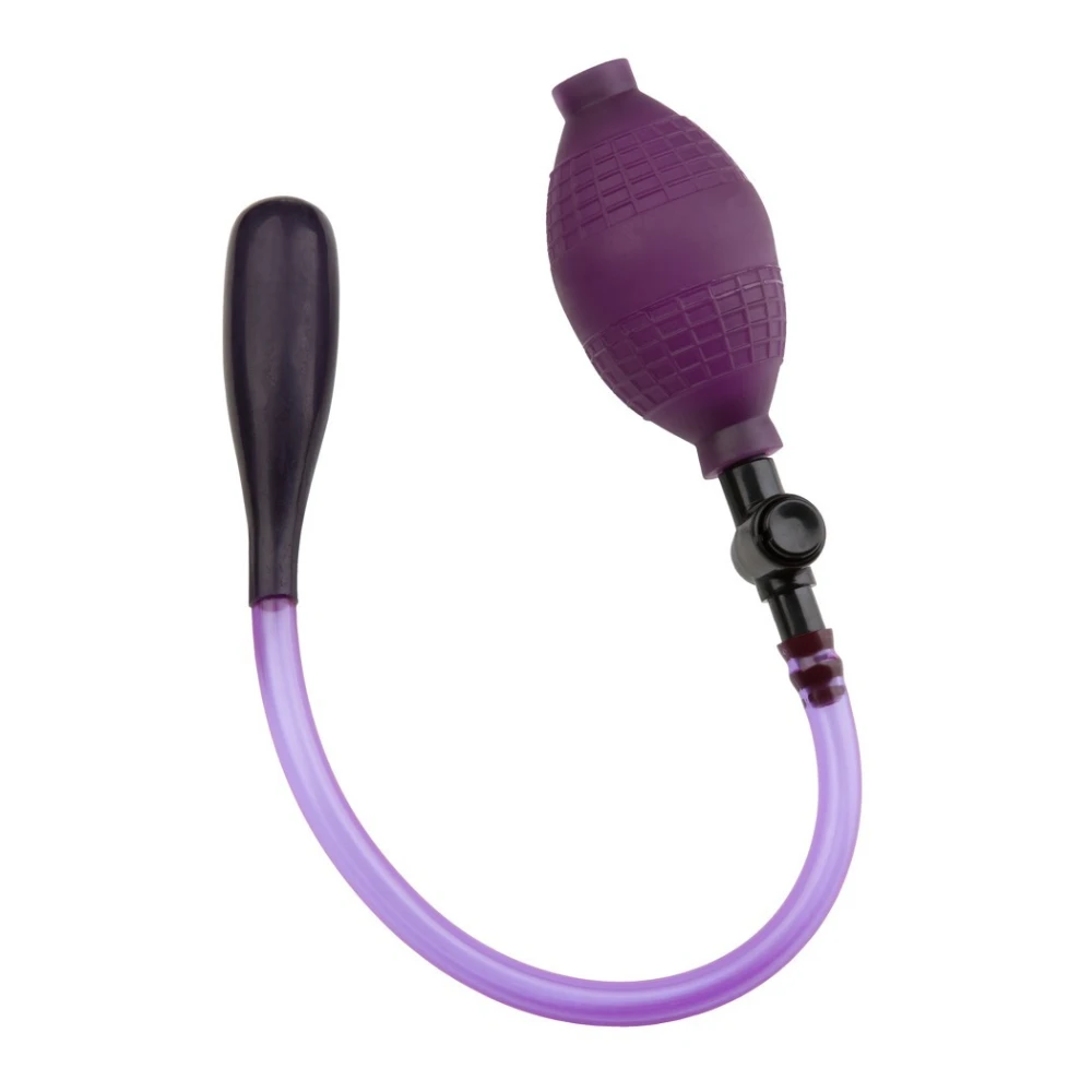 Lilafärgad latexballong med handbollspump och tryckavlastningsventil.
