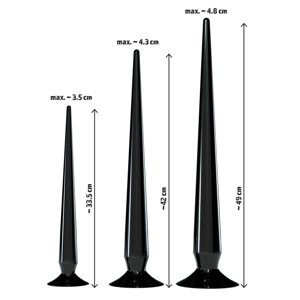 3 stycken mycket långa butt plugs i olika storlekar och vikter. Varje plugg är mycket flexibel och böjlig. Varje plugg har en mjuk spetsig topp och en sugkopp som fungerar som en propp.