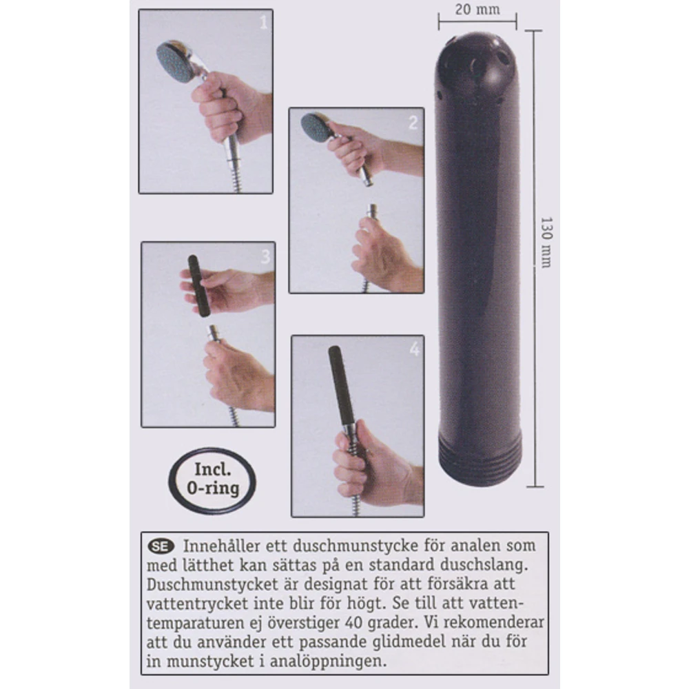 Duschmunstycket har sex mindre öppningar upptill, åt olika håll för att skölja rent utmed alla sidor av analen. Glidmedel är att rekommendera för enkelt införande och lättare rengöring. Efter att du sköljt och låtit vattnet rinna ur, skölj igen tills vattnet är helt klart. När du är färdig och ren där bak skruvar du enkelt tillbaka ditt vanliga duschhandtag och kan duscha som vanligt igen. Gängorna på produkten är europeisk och svensk standard och passar alla vanliga duschslangar.