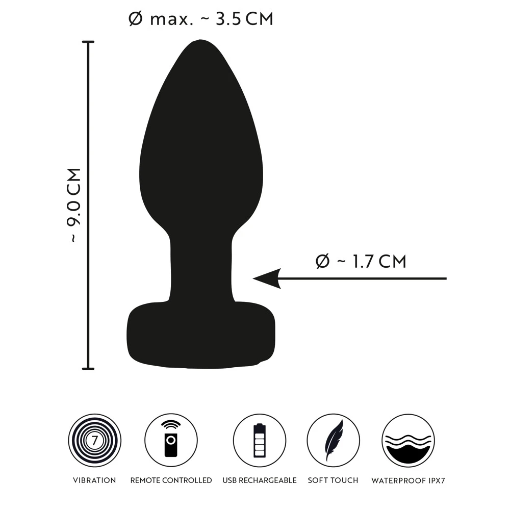 RC Flashing Butt Plug with Vibrations från ANOS med färgglatt flimrande LED-ljus i stopparen. I en klassisk kägelform för enkel införing, perfekt passform och intensivt vibrerande stimulation. Den analsäkra stopparen säkerställer en säker användning och förhindrar att den glider in för djupt. Detta innebär att den sammetslena silikonpluggen kan användas under en längre tid. Blinkar i anus och ger ett flimrande ljus in i det mystiska mörkret!