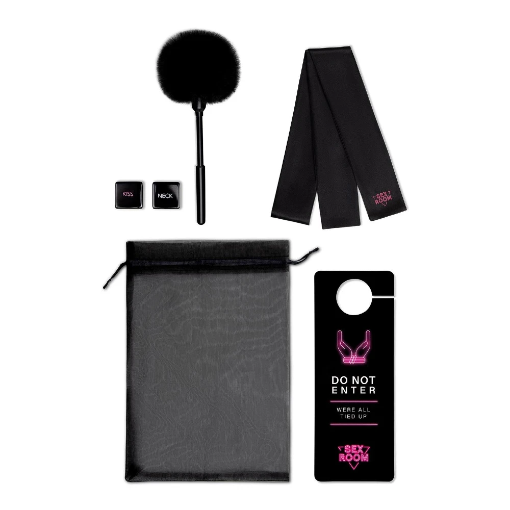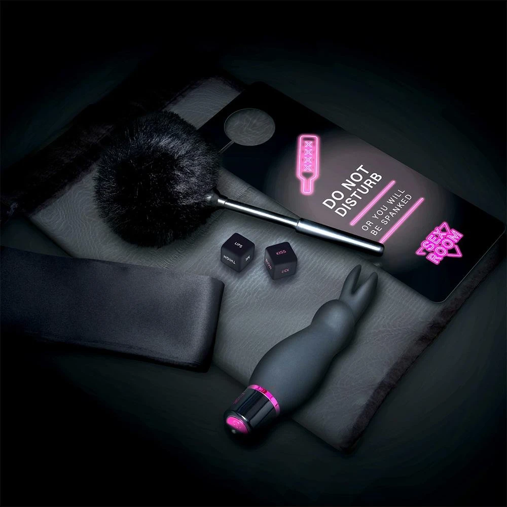 Förvandla vilket rum som helst till en destination för sensuell utforskning och oavbruten njutning med Sex Room Raunchy Kit. Setet innehåller en kraftfull vibrator med 10 virationslägen, ett par erotiska tärningar som inspirerar till beröring, en fjäderteaser och en ögonbindel i satin för sensoriska lekar.