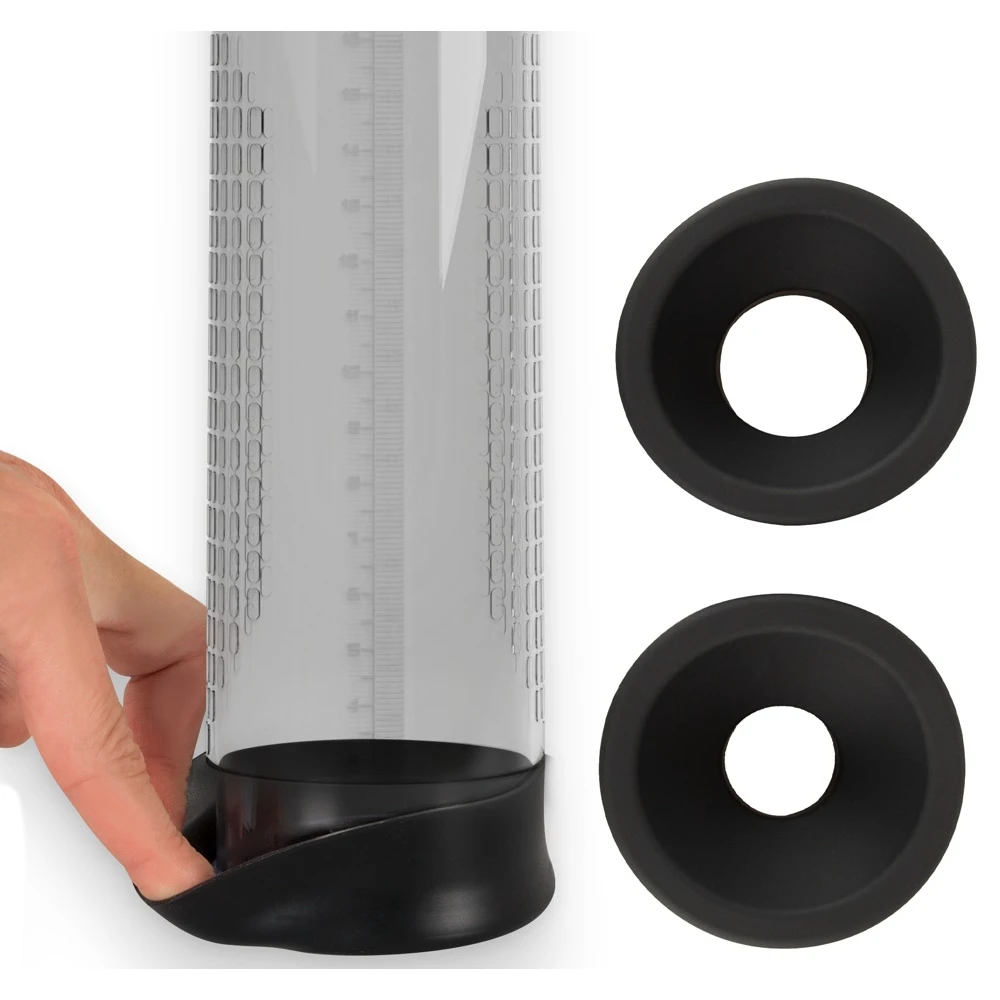 Den genomskinliga cylindern med måttskala (cm) genererar snabbt och bekvämt ett sugvakuum. Penisen kan svälla till sin maximala storlek och form. Det medföljer 2 sammetslena silikonhylsor med olika diameter för en perfekt tätning mellan cylindern och kroppen.