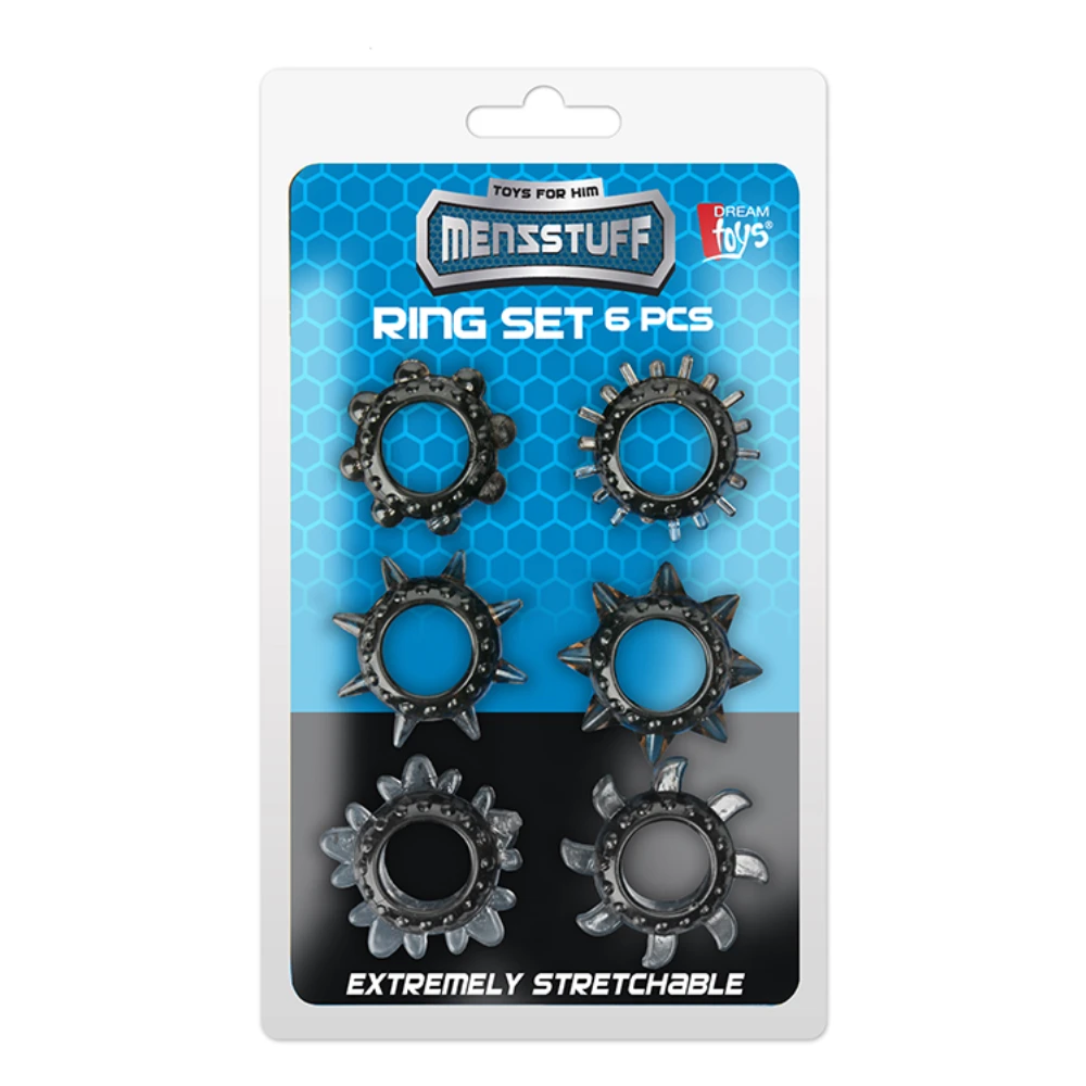 Ett set med 6 penisringar, gjorda av högkvalitativ semitransparent TPE och är extremt töjbara. Penisringarna kan förstoras 4 gånger och är superbekväma. Varje ring har olika design med speciella konturer för att stimulera de yttre delarna av kvinnans vagina vid penetration.