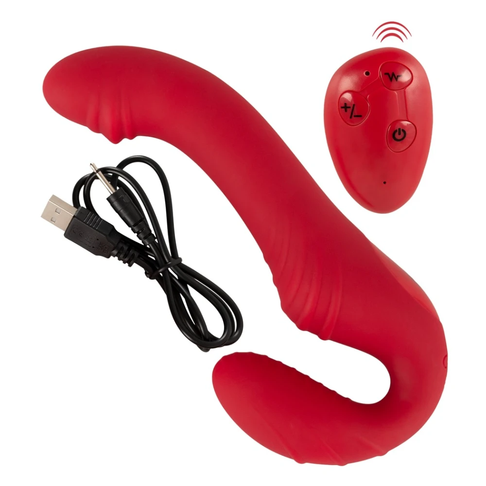 RC Strapless strap-on från You2Toys med flexibel dubbelvibrator behöver ingen sele. Den korta, vågiga vibratorn förs in i vaginan och hålls fast av de vaginala musklerna. Nu kan partnern stimuleras med den längre, strukturerade vibratorn.