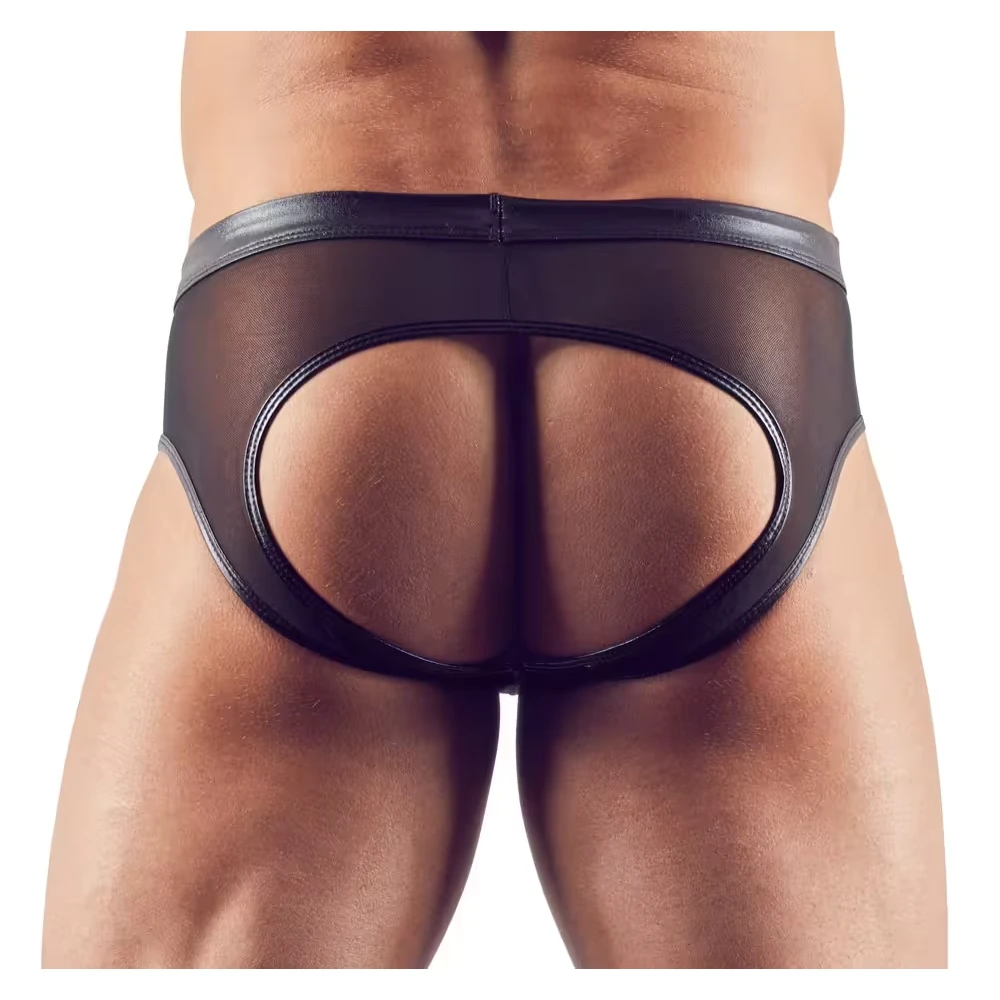 Elastisk powernet-kalsong kombinerat med wetlook. Öppen bakdel.